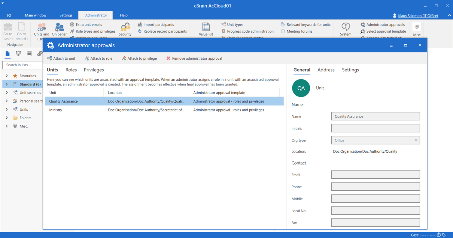Administratorgodkendelser giver kontrolleret tildeling af roller, rettigheder og „on-behalf of“-rettigheder. Følsom adgang eller højrisikoadgang gives gennem en formel godkendelsesarbejdsgang, der håndhæver fire-øjne-princippet og sikrer fuld revisionsbarhed.