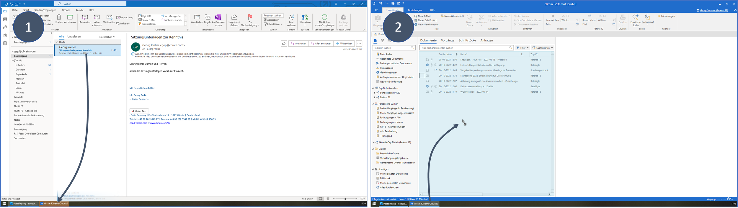 Sie können eine E-Mail aus Outlook in den Ordner auf Ihren Desktop ziehen, welcher zur Archivierung in F2 dient. Auf meiner F2-Installation heißt dieser „cF2 zur Archivierung“, auf ihrem Computer wird dieser wahrscheinlich ähnlich heißen.