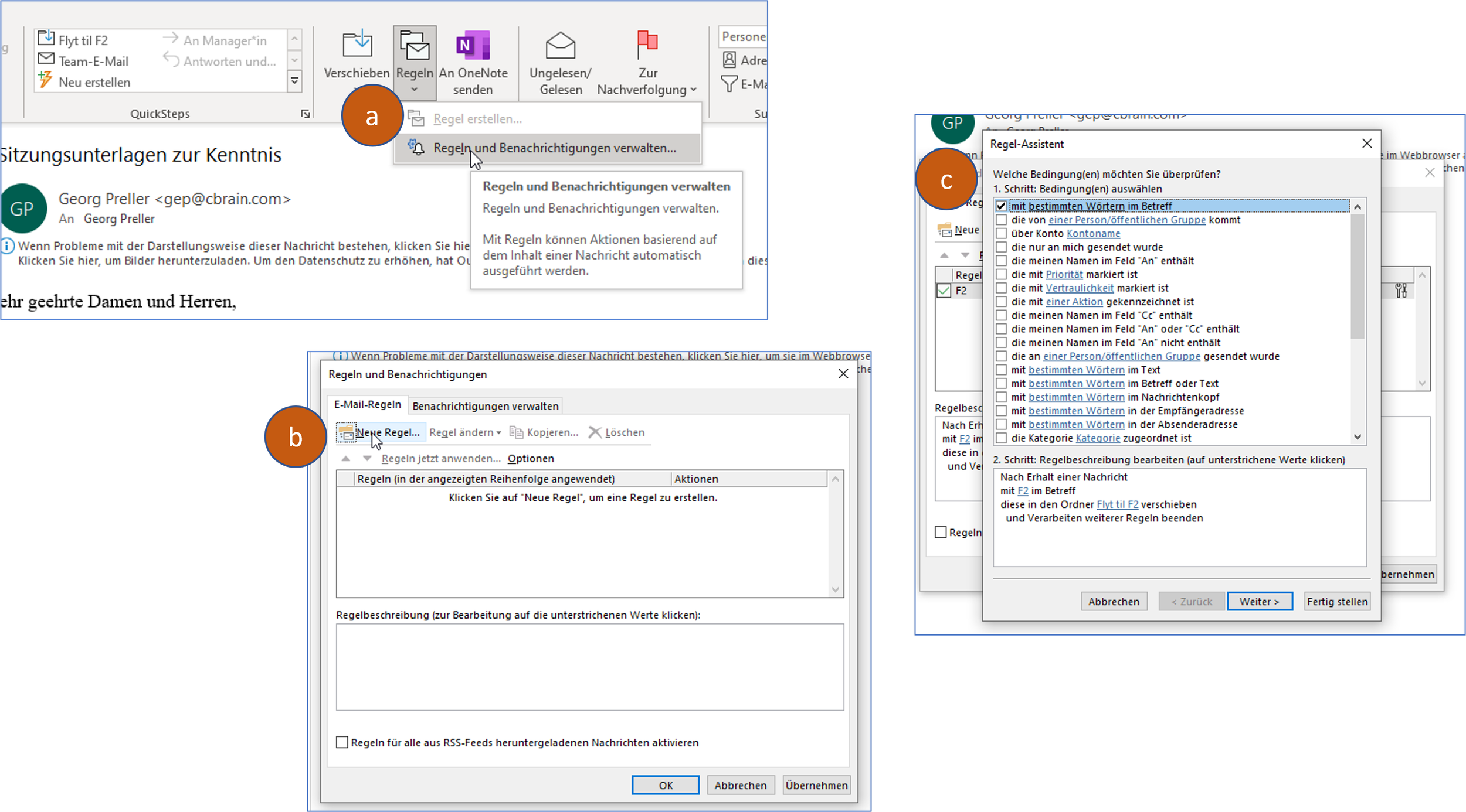 - (c) - Im Regelassistenten die entsprechenden Einstellungen vornehmen. Als Beispiel haben wir gewählt, dass der Betreff einer E-Mail „F2“ enthält. Diese E-Mails sollen in den Ordner „Nach F2 verschieben“ verschoben werden.