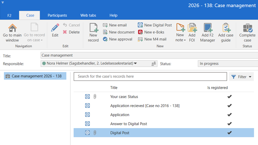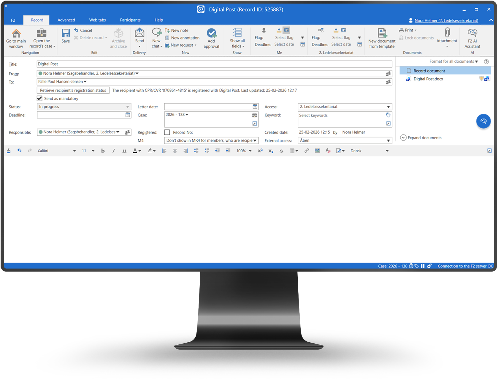 Digital Post integriert offizielle digitale Post direkt in Fälle und Aufzeichnungen und gewährleistet so eine konforme Zustellung, Dokumentation und lückenlose Rückverfolgbarkeit.